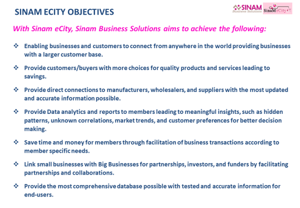 Sinam eCity is a virtual business community platform where business transactions and partnerships can happen safely and conveniently both locally and internationally.’Visit our new eCity Community Website